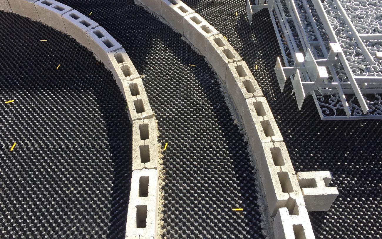 El elemento de drenaje y almacenamiento de agua Floradrain® FD 40-E, instalado en toda la superficie, se utiliza como encofrado permanente para el camino de bloques huecos de hormigón.